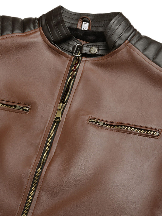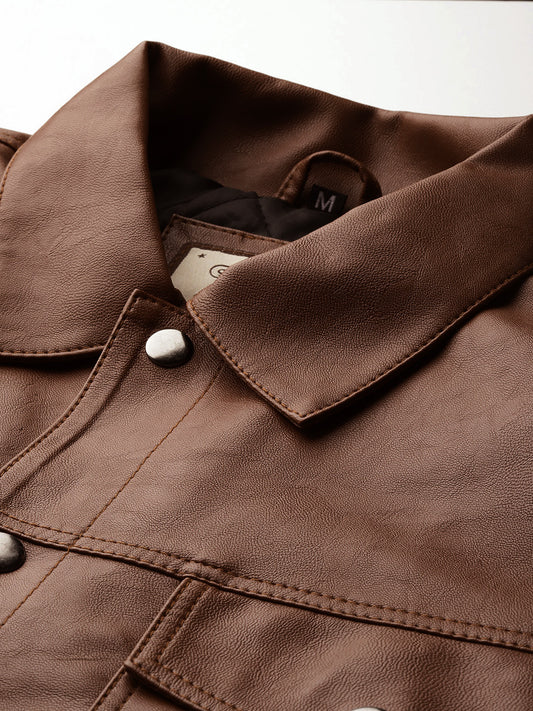 Leather Retail Brown Faux Leather Jacket for Men's with Snap Button Closure