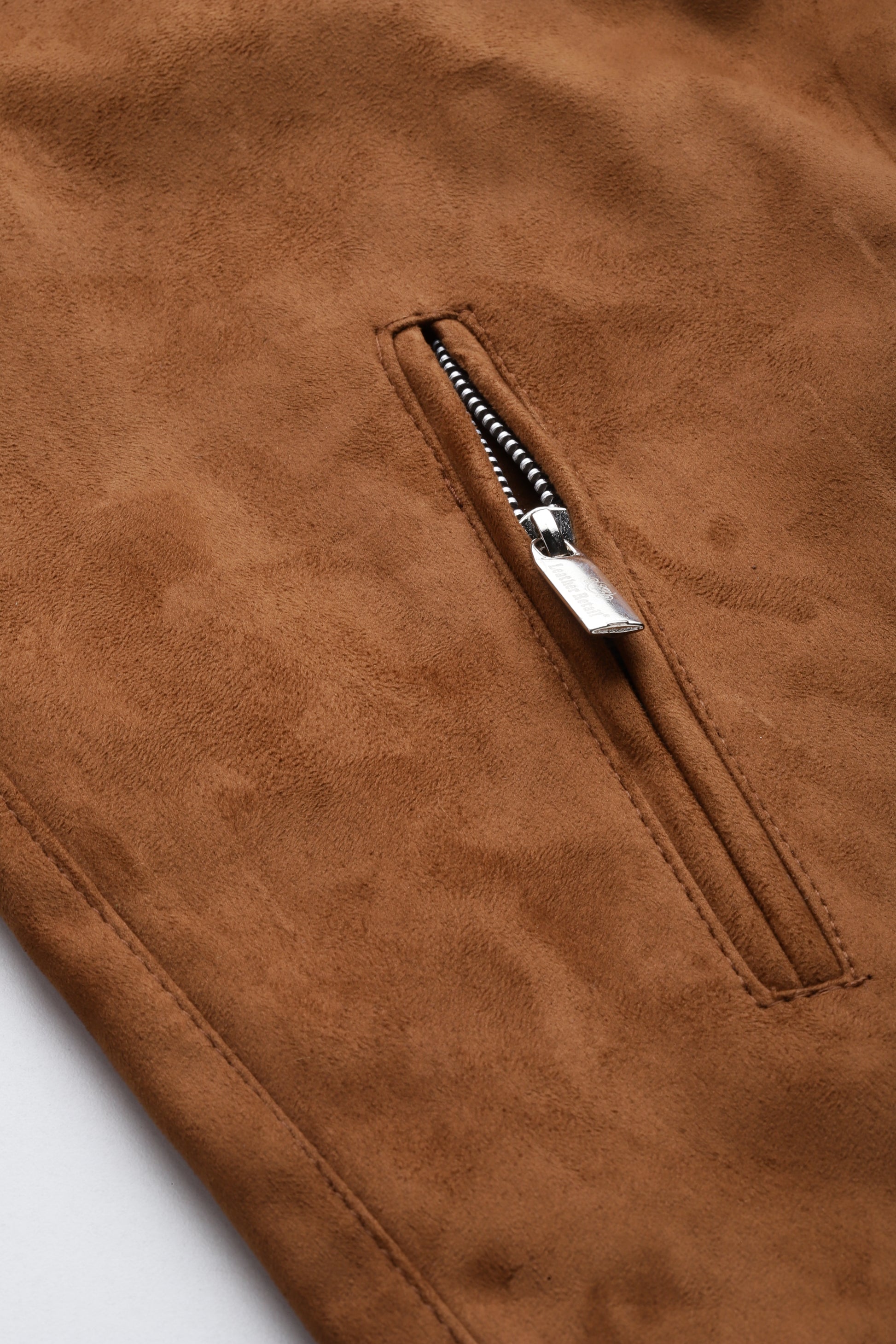 This product is a Suede classic style faux leather jacket. It features a zippered front closure, multiple zippered pockets on the front for functional and stylish detailing, and a band collar. The jacket appears to have a regular fit, suited to provide a sleek and timeless look. The artificial leather material used gives it a smooth finish and versatile appearance, making it suitable for a variety of occasions from casual outings to more dressed-up events. The neutral Brown color adds to its adaptability and ease of pairing with various attires.